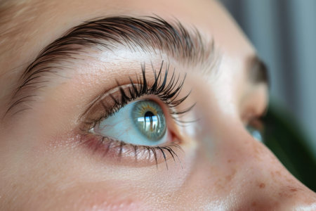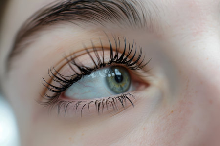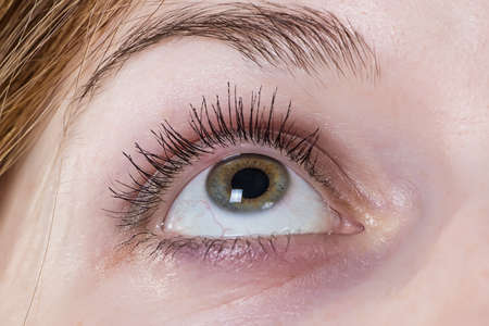 female open eye green color with long lush black eyelashes and eyebrow on clean skin of young woman, closeup
