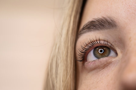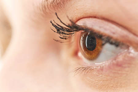 eye of woman or girl, brown color, with long eyelashes and eyebrow on young face skin. No makeup. Natural beauty. Sight. Vision. Ophthalmology