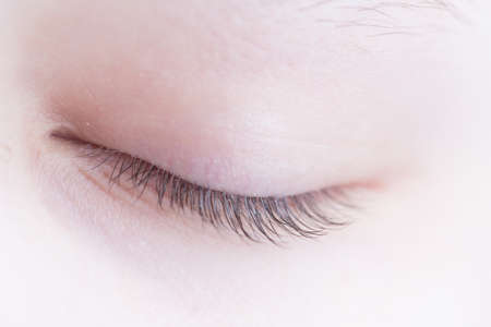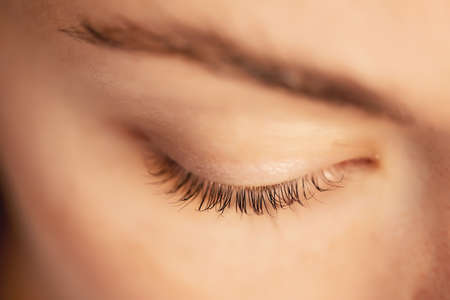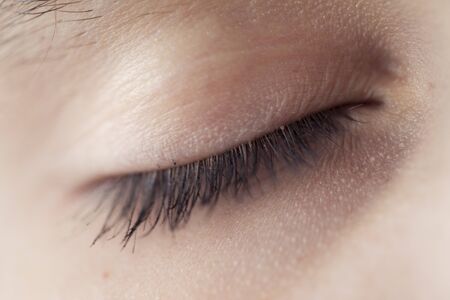 closed human eye. Closed eyelid with eyelashes. Indoor photo with shallow depth of field.