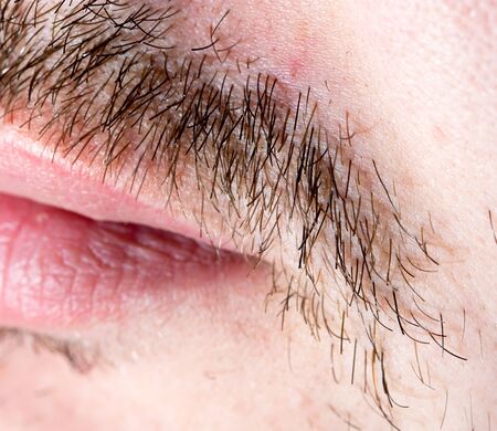 Selective focus eye of caucasian man. Macroshot texture of male skin surface, retina, eyelashes, eyebrows. Сoncept of importance of vision in human life. Eyesight is sensory sensation that perceives images.