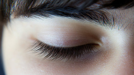 This close-up image captures a beautifully closed eye, showcasing long eyelashes and delicate skin, emphasizing natural beauty in soft lighting ideal for relaxation themes.