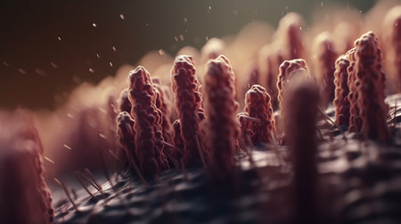 Dense cell monolayer with oscillating microcilia in scientific. Generative AI