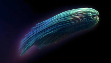 Abstract digital art featuring a teal and blue filament structure against a black background.