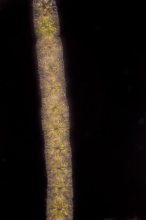 Microscopic View of Filamentous Algae (Oedogonium) with Potential Dwarf Male Filaments