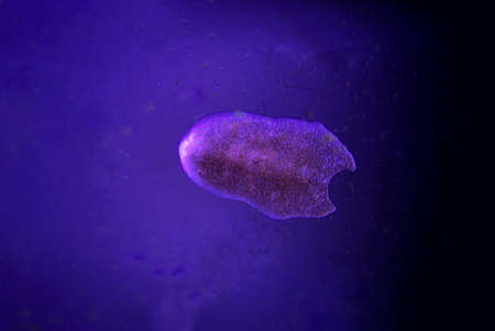 Planarian parasite (flatworm) under microscope view.