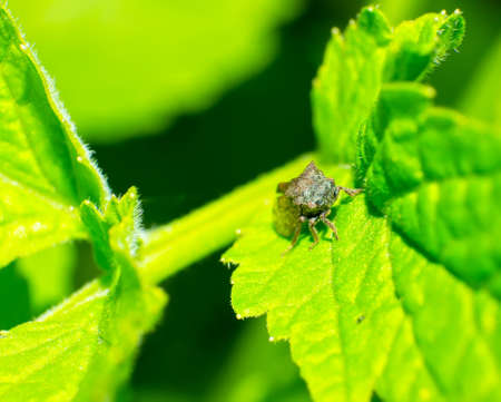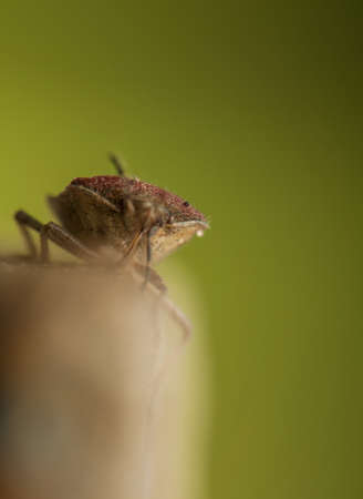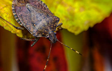 Brown marmorated stink bug in macro close up photo in natural habitat