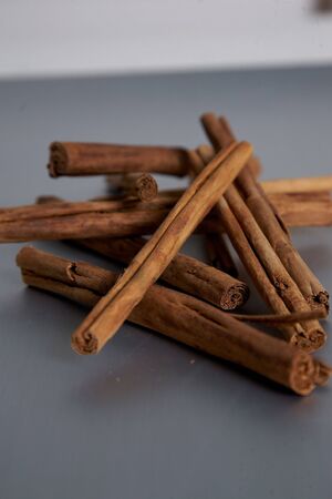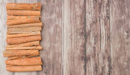 Dry cinnamon sticks on a kitchen table. Top view. Cinnamon spice.