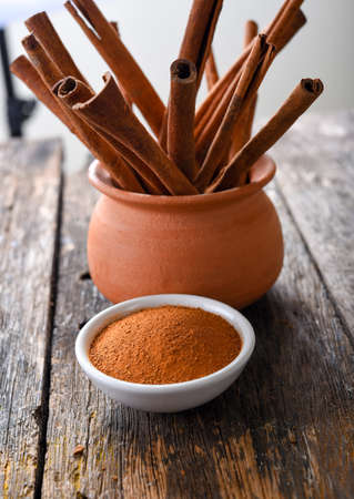Cinnamon sticks and cinnamon powder on a wooden table.
