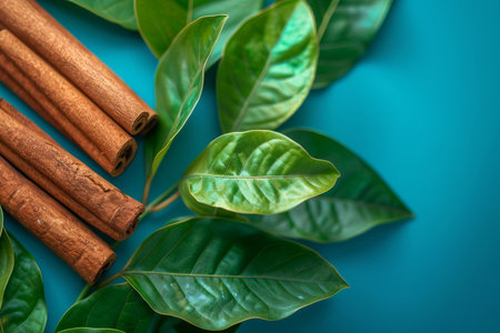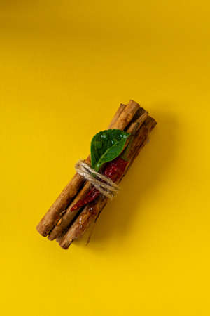 a bunch of cinnamon sticks on a colored background with red dried peppers and a green leaf. Water drops on cinnamon