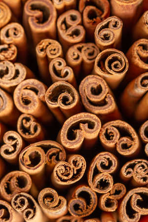 A close-up shot of a pile of cinnamon sticks, showing their texture and color variations.
