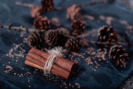 Close-up of cinnamon sticks tied with rope and powdered of black background.Copy space.