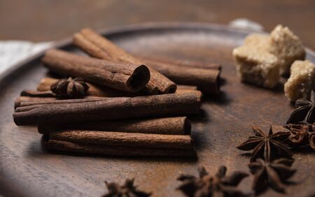 Cup of cinnamon sticks and anise star - spices for mulled wine cooking on dark stone background with copy space