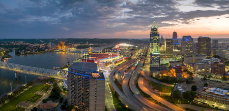 Cincinnati Ohio urban architecture in city downtown at sunset. Panoramic view of business district skyline with high-rise buildings at nightfall