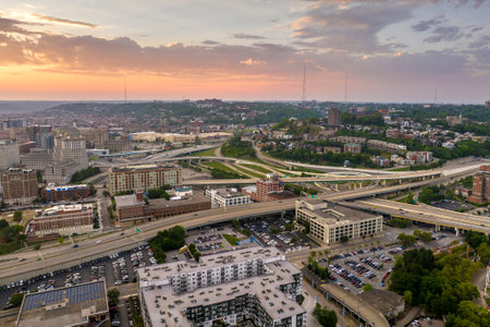 View from above of USA transportation infrastructure. Aerial view of American highway junction at sunset with fast driving vehicles in Cincinnati, Ohio