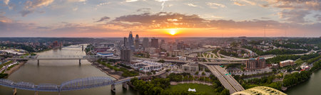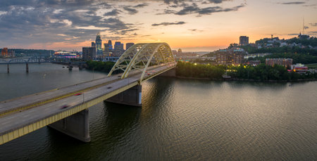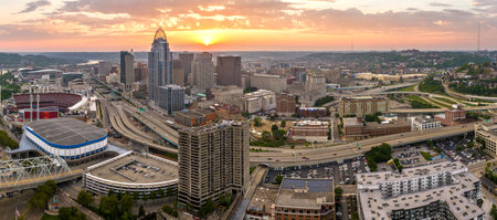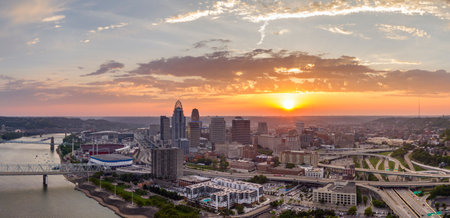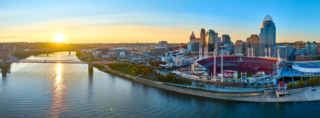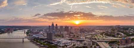 Aerial Panorama Cincinnati Skyline Sunset with Ohio River and Bridge