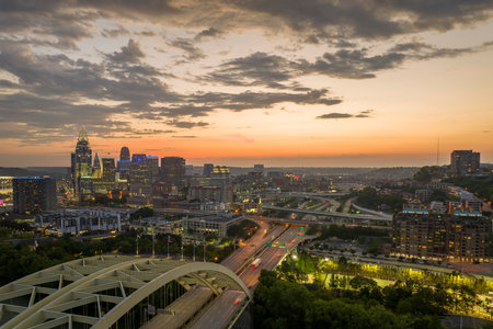 Cincinnati city, Ohio, USA with bridge highway traffic driving cars in downtown district. American city skyline with brightly illuminated high commercial buildings at sunset