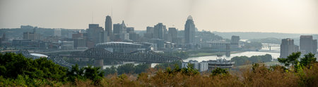Aerial view of Downtown Cincinnati and the bridges crossing the Ohio River from Kentucky to Ohio. Photographed from Devou Park, which has a commanding view of downtown Covington, Kentucky and Cincinnati, Ohio.
