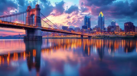 The Cincinnati skyline comes to life at sunset, showcasing vibrant colors reflected on the Ohio River, with the bridge connecting the city against a dramatic sky.