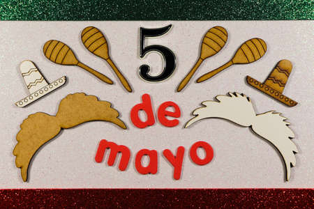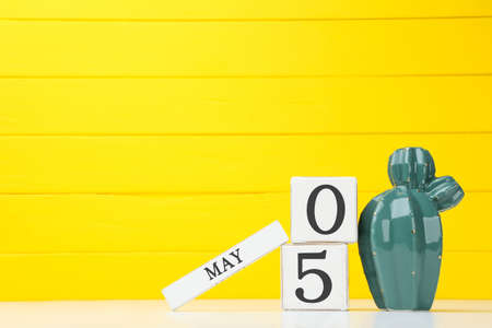 Mexican fiesta and Cinco de Mayo party concept theme with calendar on May 5th, red jalapeno pepper necklace, maracas, cactus, traditional rug and sombrero shaped confetti on yellow background