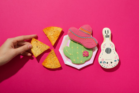 Cinco de Mayo holiday background with Mexican cactus, nachos chips, maracas and party sombrero hat. Top view, flat lay