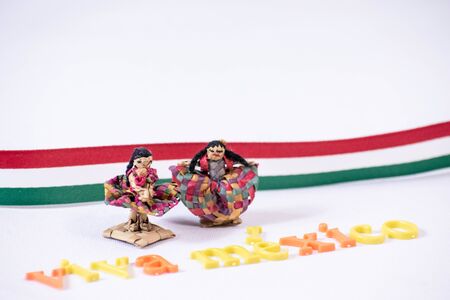 Little traditional mexican dolls and Viva Mexico made from colorful letters on white background