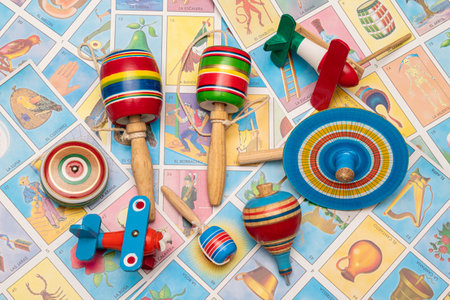 Baleros of different sizes, yoyo, noisemaker, spinning top, airplane and trompo, traditional mexican toys on lottery background