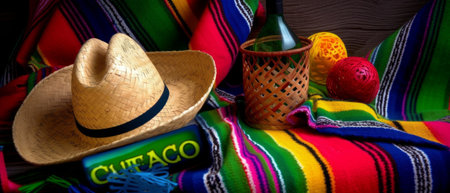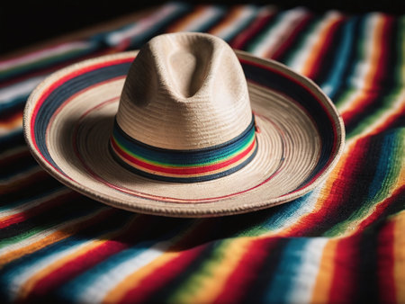 Mexican hat on a colorful striped blanket. Selective focus.