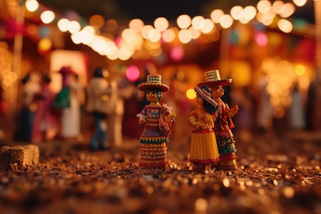 Traditional Mexican doll figurines in vibrant costumes, set against a background of desert plants and mountains