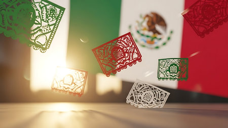 Colorful papel picado decorations hang outdoors in festive atmosphere. That the image is generated using AI.