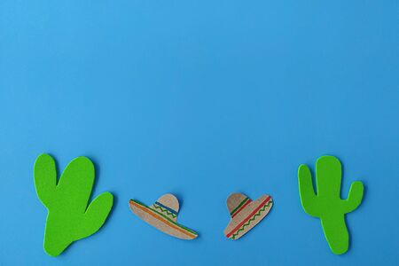 Cinco de Mayo with a Mexican cactus and a sombrero hat on a blue background. Fiesta, usa, mexican holiday.