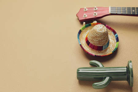 Mexican sombrero, guitar and ceramic cactus on color background