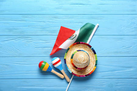 Mexican flag, maracas and sombrero on color wooden background