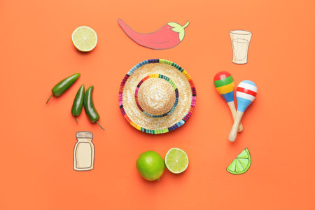 Composition with symbols of Mexico on color background