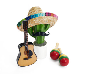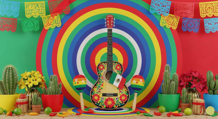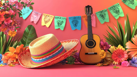 Colorful sombrero and guitar with vibrant flowers on a festive backdrop, ideal for celebrations or cultural events