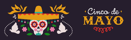 Happy Cinco de Mayo web banner illustration for Mexican independence holiday celebration. Cartoon sugar skull with mariachi hat and traditional culture decoration.