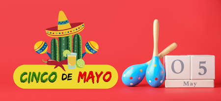 Mexican maracas and calendar with date 5 May (Cinco de Mayo) on color background