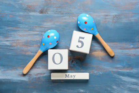 Mexican maracas and calendar with date May 5 (Cinco de Mayo) on wooden background
