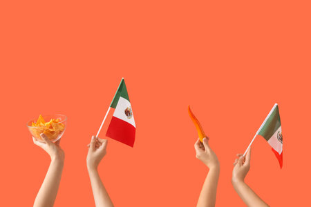 Female hands holding nachos, chilli pepper and Mexican flags on orange background