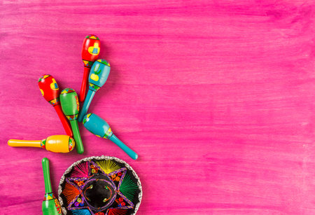 Cinco de Mayo background image on with maracas and sombrero on wooden rustic boards