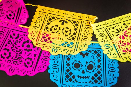 Decorations for traditional Mexican holiday Day of the Dead on a black background.