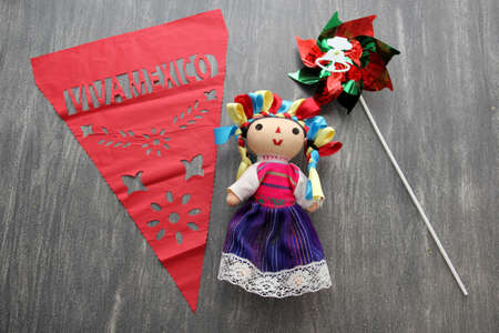 Small doll representing a Mexican woman with hat and Mexican flag. Isolated figure on blue background.