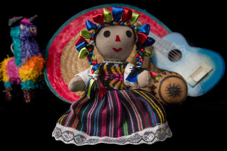 Mexican doll, pinata, guitar, hat, and maracas isolated on black background