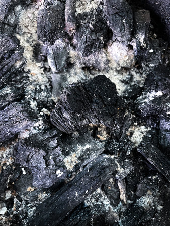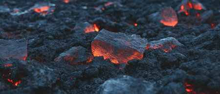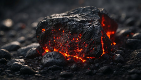This image features a close-up of glowing charcoal embers. The composition showcases textured black and red forms, suggesting heat and energy. The lighting emphasizes the fiery glow within the charcoal. This image could be used for various projects needing a backdrop, texture or a symbol of warmth and energy.