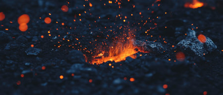 Glowing fire embers scatter warmth against a dark background in an evening display