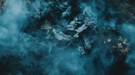 This captivating image showcases charred wood remnants enveloped in soft misty smoke, presenting a serene and artistic representation of nature's transformation.