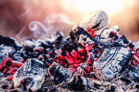 Hot red coals fire with smoke. Texture on a picnic outdoor