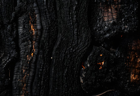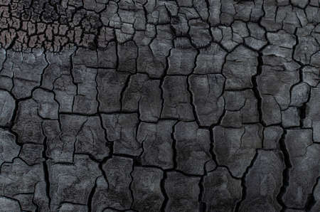 Background, black charred timber, coal after fire, abstract and in cracks of charcoal.