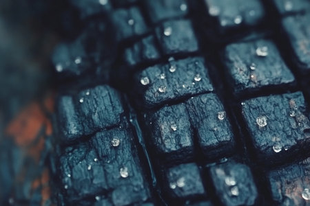 Raindrops rest on a dark, textured charcoal surface, creating a striking contrast. The wet droplets catch the light, enhancing the intricate patterns formed by the charcoal's grooves, revealing a natural beauty in a forgotten piece of material.