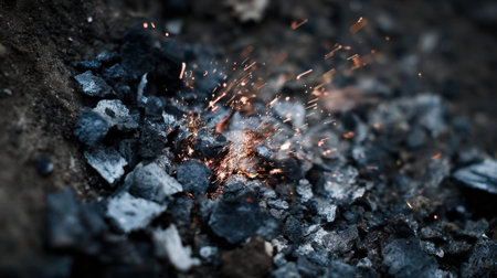 A worker hammers hot metal on coal sending bright sparks into the air. The dark rough surface of coal contrasts with the glowing embers. This scene captures intense craftsmanship and energy.