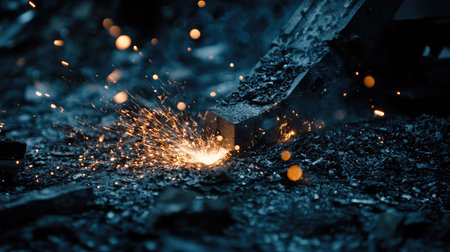 A dynamic close-up image capturing the sparks flying from a metal surface during a cutting process in a dimly lit workshop, showcasing the intense energy and craftsmanship involved.